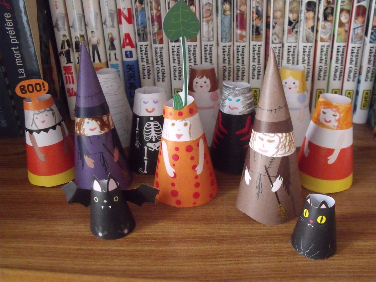Décorer à moindre frais : cet année, le restaurant où travaille mon chéri n'avait pas prévu de décorer pour Halloween. Il a donc obtenu d'emprunter des décorations, que nous rendrons demain. Le chamboultou a été fait dans des boites à glace (du même restaurant). J'avais tout de même imprimé deux pages de paper toys pour décorer la bibliothèque.